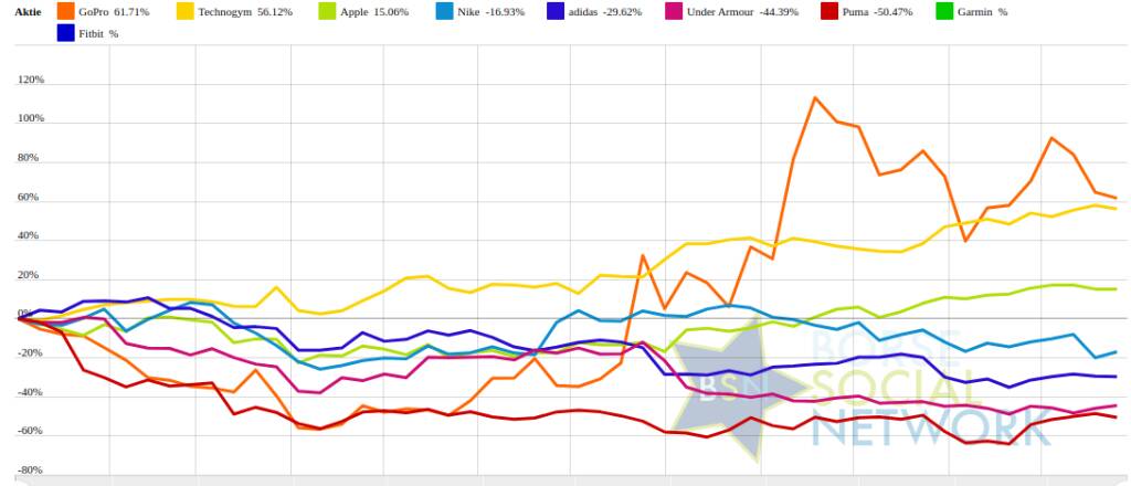 Weitere Highlights: Under Armour ist nun 4 Tage im Plus (2,65% Zuwachs von 4,53 auf 4,65), ebenso Nike 3 Tage im Plus (6,48% Zuwachs von 57,22 auf 60,93), Nike 3 Tage im Minus (12,57% Verlust von 122,53 auf 107,13), Puma 3 Tage im Minus (7,27% Verlust von 23,24 auf 21,55).
