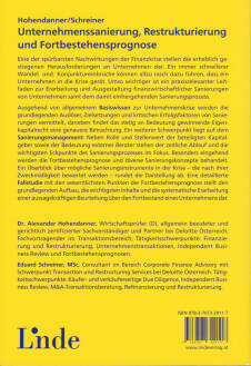 Leitfaden zur Unternehmenssanierung Der vorliegende praxisorientierte Leitfaden unterstützt bei Erarbeitung und Ausgestaltung finanzwirtschaftlicher Sanierungen von Unternehmen samt dem damit einhergehenden Sanierungsprozess: Basiswissen zur Unternehmenskrise: Definition, Krisenarten sowie Krisenverlauf mit Ursachen und Symptomen Grundlegende Auslöser, Zielsetzungen und kritische Erfolgsfaktoren von Sanierungen Eigenkapitalrecht Schwerpunkt Sanierungsmanagement: beteiligte Kapitalgeber; Bedeutung externer Berater; zeitlicher Ablauf und Eckpunkte des Sanierungsprozesses; eingehende Behandlung der Fortbestehensprognose und diverser Sanierungskonzepte; Überblick über mögliche Sanierungsinstrumente in der Krise Detaillierte Fallstudie mit den wesentlichsten Punkten der Fortbestehensprognose und praxisrelevante Interviews