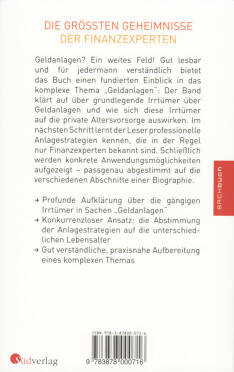 Welches sind die gängigen Irrtümer über Geldanlagen? Wie lauten die größten Geheimnisse der Finanzexperten? Und wie kann man ohne Geldsorgen in jedem Lebensalter leben? Gut lesbar und für jedermann verständlich bietet das Buch einen fundierten Einblick in das komplexe Thema Geldanlagen: Es klärt auf über die grundlegenden Irrtümer über Geldanlagen und wie sich diese Irrtümer auf die private Altersvorsorge auswirken. Im nächsten Schritt lernt der Leser professionelle Anlagestrategien kennen, die in der Regel nur Finanzexperten, nicht aber dem Otto-Normal-Bürger bekannt sind. Schließlich werden konkrete Anwendungsmöglichkeiten aufgezeigt, passgenau abgestimmt auf die verschiedenen Lebensabschnitte einer Biographie. Neben seiner Praxisnähe zeichnet sich der Band durch die Veranschaulichung der aufgezeigten Zusammenhänge über konkrete Beispiele aus der Finanzwelt aus.