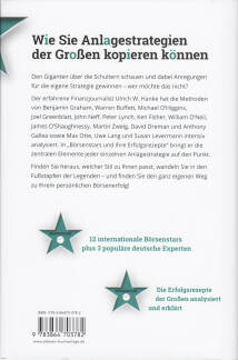 Von den großen Investoren kann man sich einiges abschauen doch was ist für Privatanleger wirklich brauchbar? Ulrich W. Hanke nimmt die Strategien von Benjamin Graham, Warren Buffett, Michael O Higgins, Joel Greenblatt, John Neff, Peter Lynch, Ken Fisher, William O Neil, James O Shaughnessy, Martin Zweig, David Dreman und Anthony Gallea unter die Lupe. Hinzu kommen populäre deutsche Börsenstrategen wie Max Otte, Uwe Lang und Susan Levermann. Hanke analysiert die Methoden der Börsenlegenden und arbeitet heraus, wie die Systeme funktionieren, welche Kennzahlen und welche Werte dabei wichtig sind. Er gibt Anlegern Filter und Checklisten an die Hand, mit denen sie in den Fußstapfen der Börsenstars wandeln können.